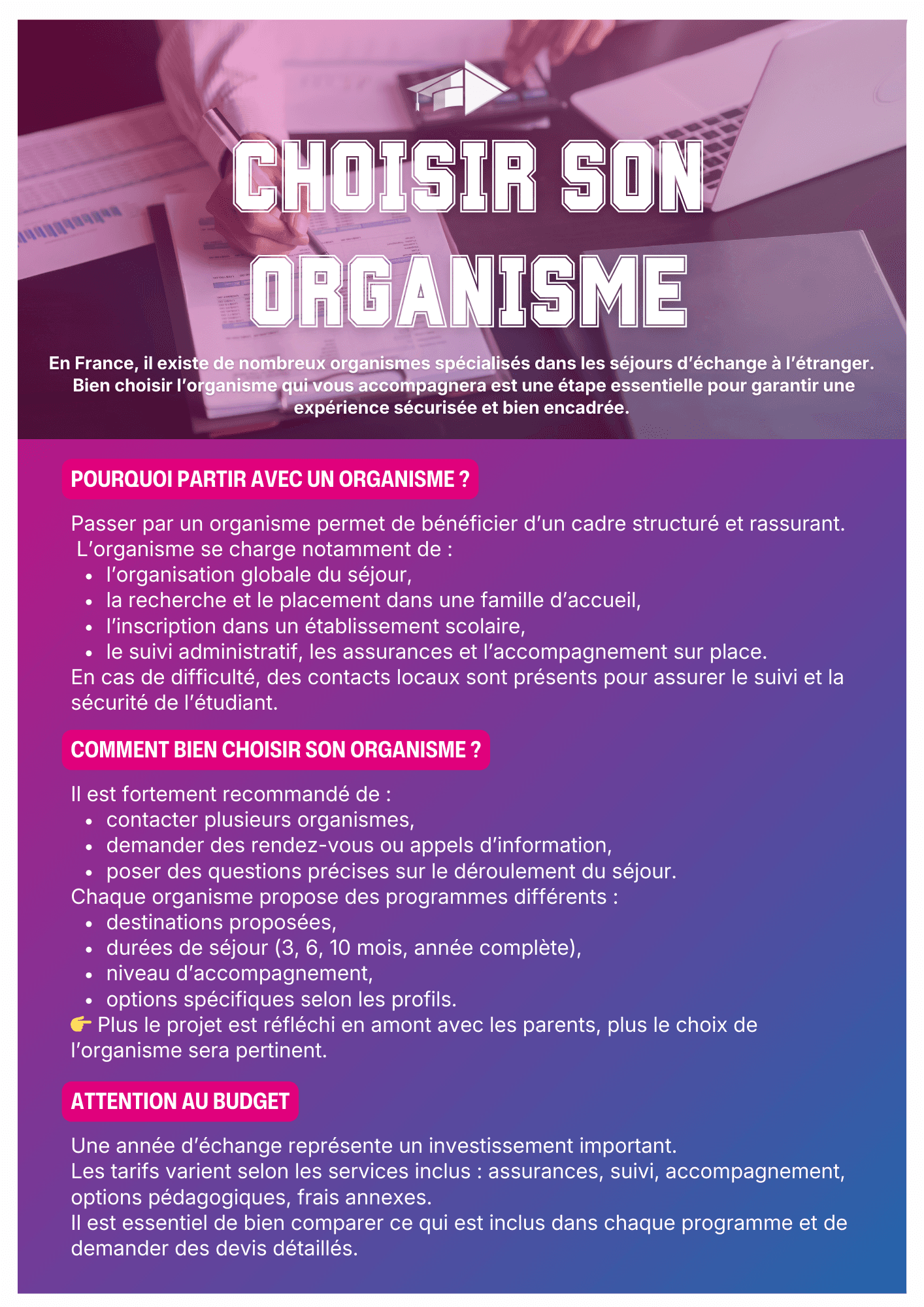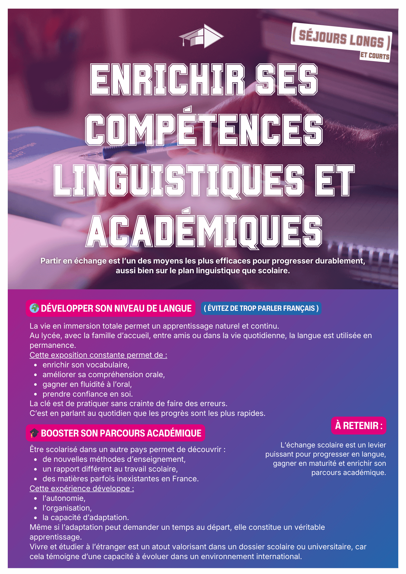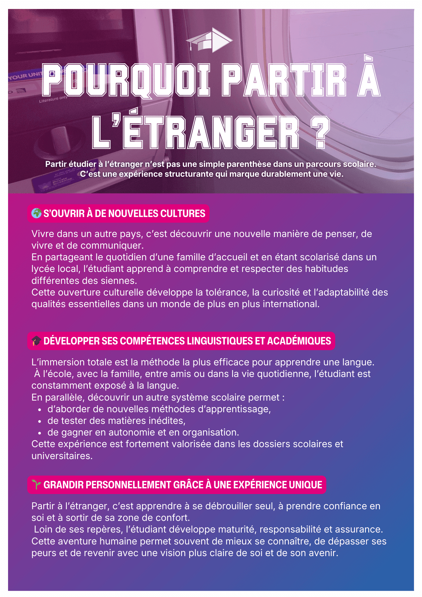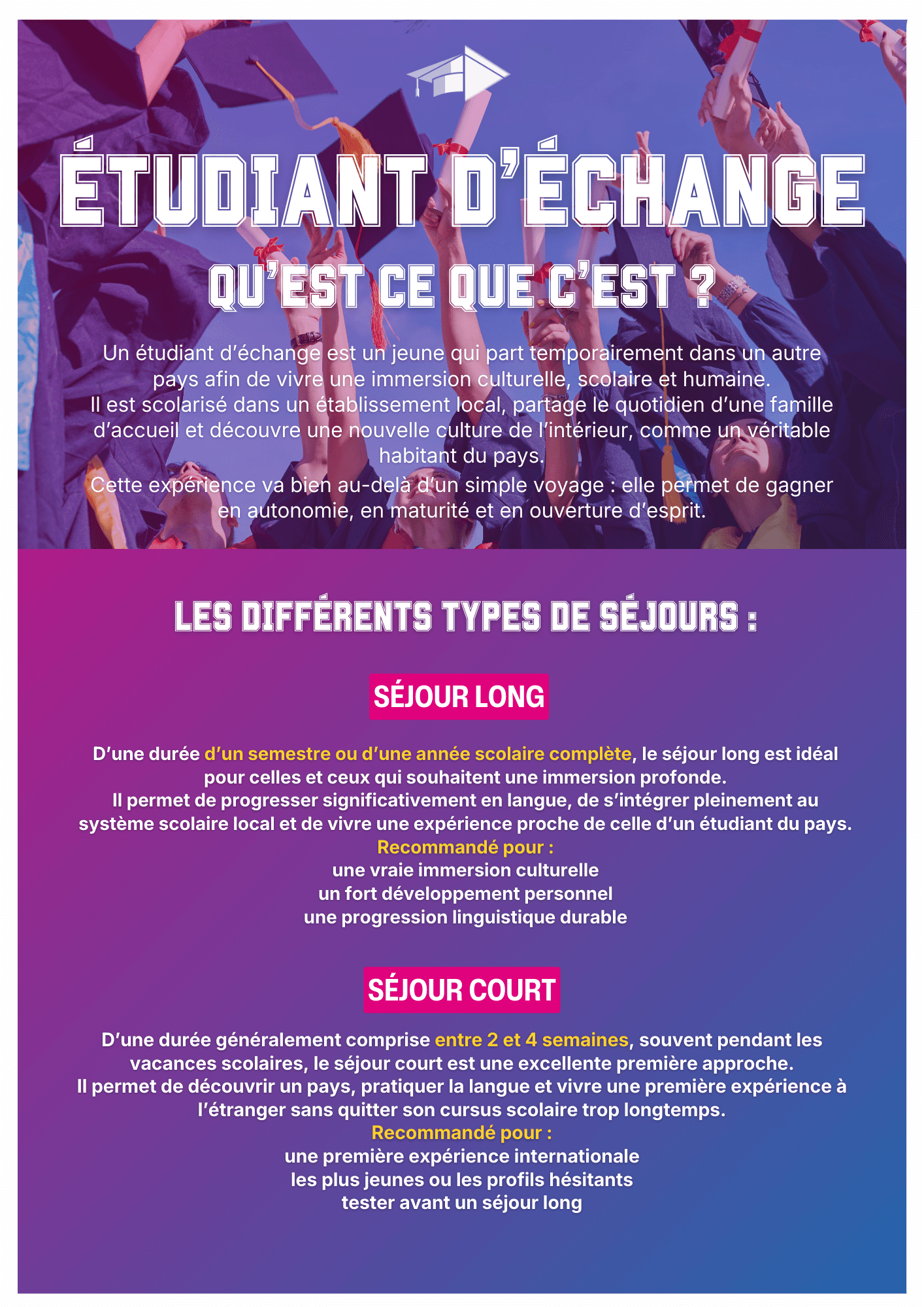 Guides gratuits, clairs et utiles pour aider les jeunes et les familles à comprendre l’échange scolaire et se projeter sereinement et prendre les bonnes décisions, au bon moment.